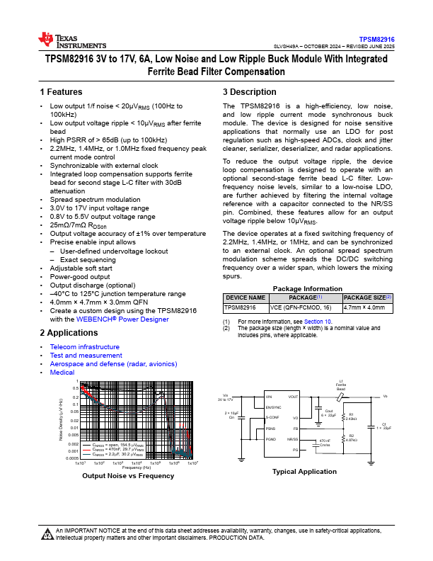 The TPSM82916 is a high-efficiency, low noise, and low ripple current mode synchronous buck module. The device is designed for noise sensitive applications that normally use an LDO for post regulation such as high-speed ADCs, clock and jitter cleaner, serializer, deserializer, and radar applications. To reduce the output voltage ripple, the device loop pensation is designed to operate with an optional second-stage...
