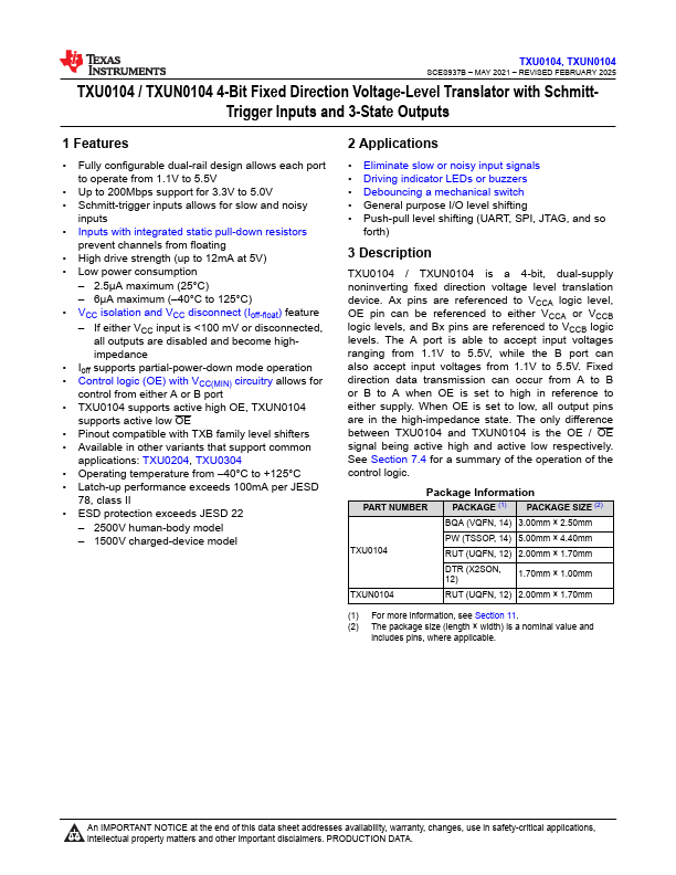 - Available in other variants that support mon applications: TXU0204, TXU0304