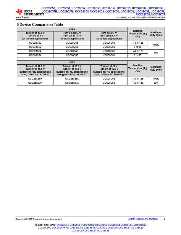 The UCCx8C5x family of devices are highperformance current-mode PWM controllers that can drive both Si and SiC MOSFETs in various applications. The UCCx8C5x family is a more efficient and robust version of the UCCx8C4x. The UCCx8C5x family has new UVLO thresholds that allow for reliable SiC MOSFET operation (UCC28C56-59), in addition to existing UVLO thresholds for continued Si MOSFET support (UCCx8C50-55).