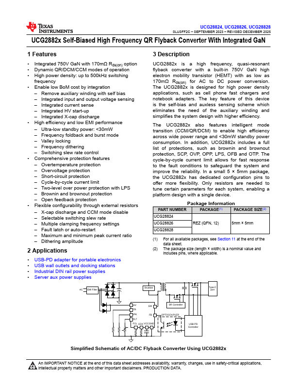 Overview: UCG28824, UCG28826, UCG28828 SLUSFF2C – SEPTEMBER 2023 – REVISED DECEMBER 2025 UCG2882x Self-Biased High Frequency QR Flyback Converter With Integrated GaN.