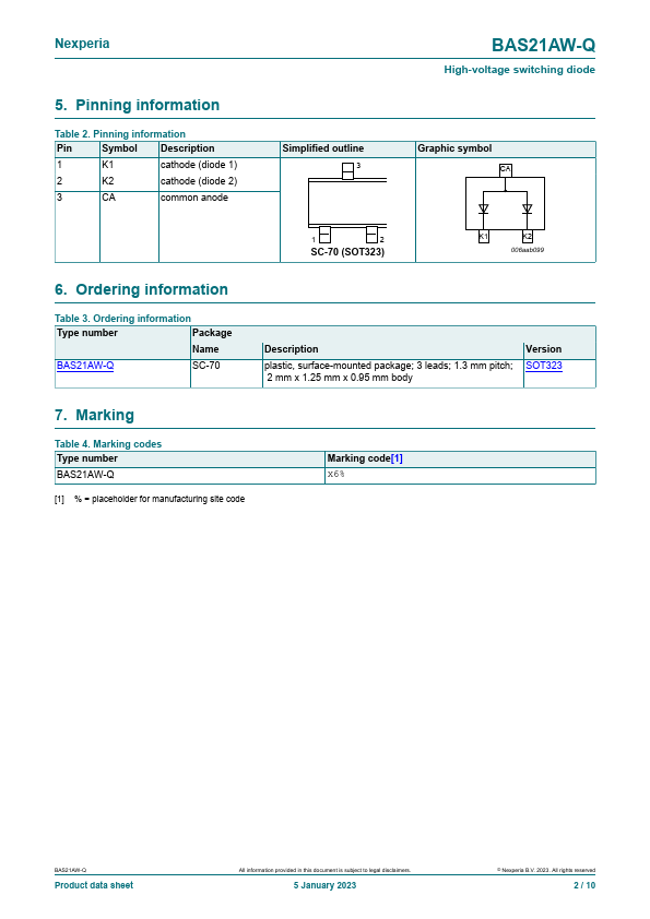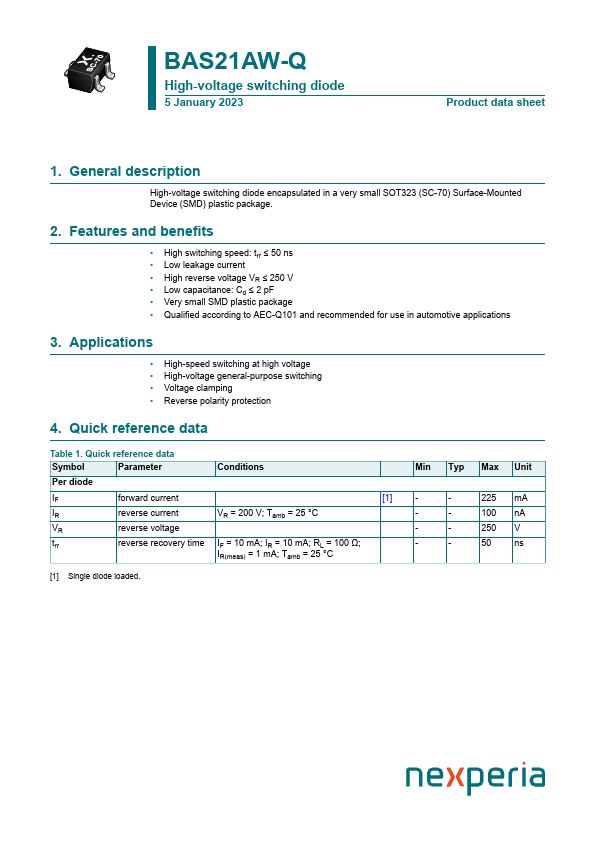 High-voltage switching diode encapsulated in a very small SOT323 (SC-70) Surface-Mounted Device (SMD) plastic package.