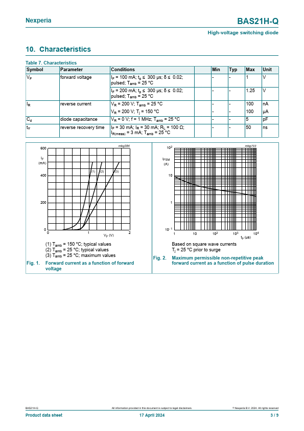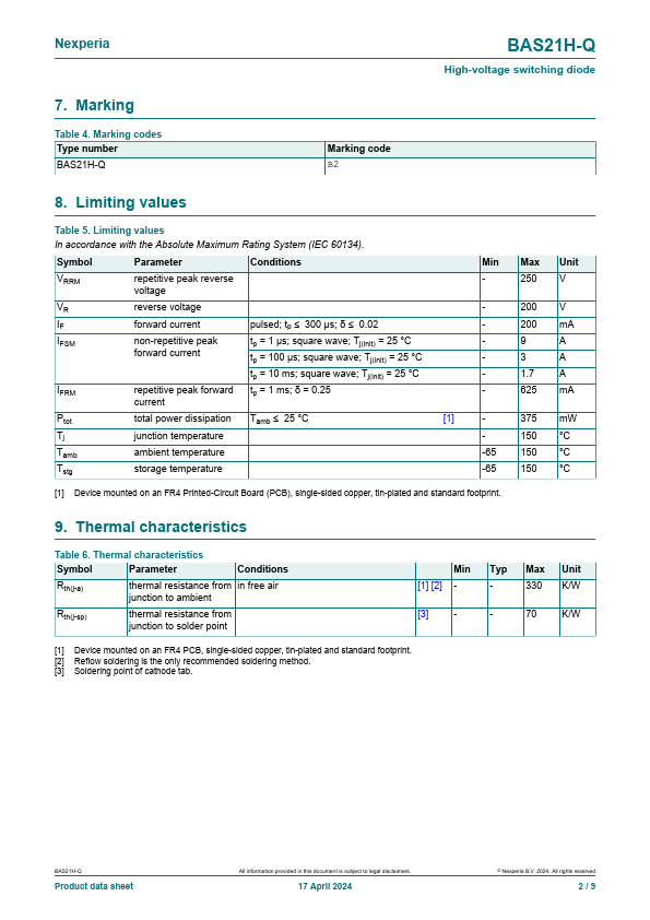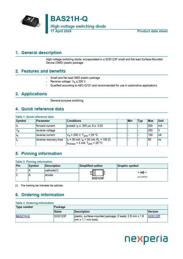 High-voltage switching diode, encapsulated in a SOD123F small and flat lead Surface-Mounted Device (SMD) plastic package.