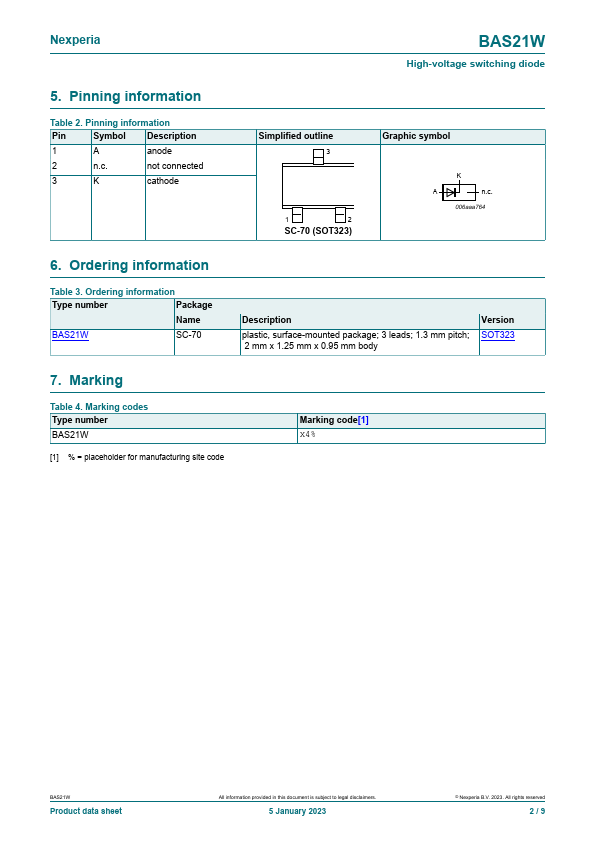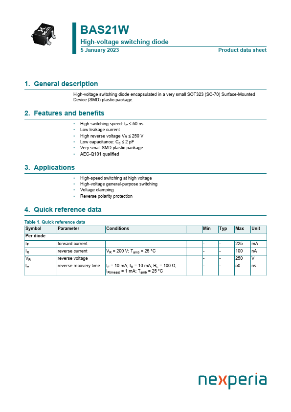 High-voltage switching diode encapsulated in a very small SOT323 (SC-70) Surface-Mounted Device (SMD) plastic package.