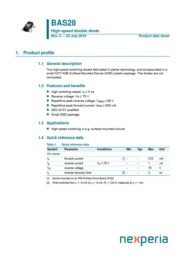 Two high-speed switching diodes fabricated in planar technology, and encapsulated in a small SOT143B Surface-Mounted Device (SMD) plastic package. The diodes are not connected.