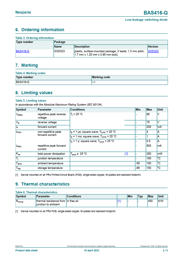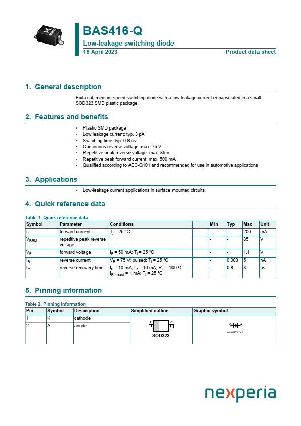 Epitaxial, medium-speed switching diode with a low-leakage current encapsulated in a small SOD323 SMD plastic package.