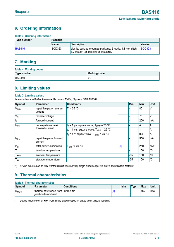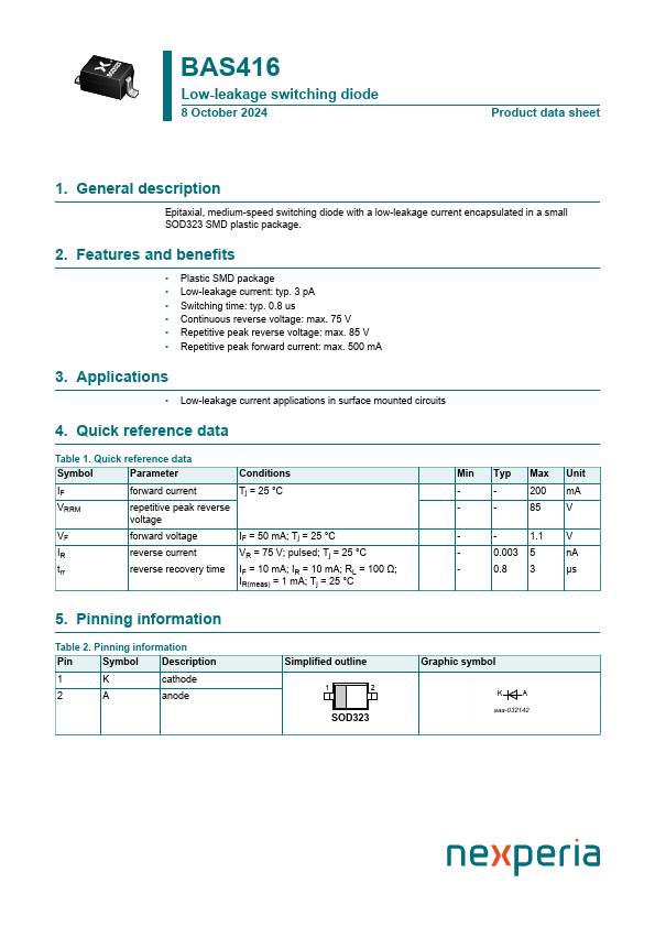Epitaxial, medium-speed switching diode with a low-leakage current encapsulated in a small SOD323 SMD plastic package.
