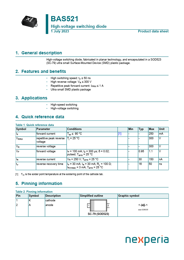 High-voltage switching diode, fabricated in planar technology, and encapsulated in a SOD523 (SC-79) ultra small Surface-Mounted Device (SMD) plastic package.