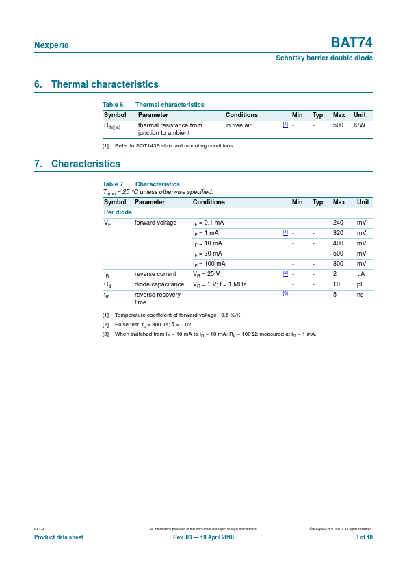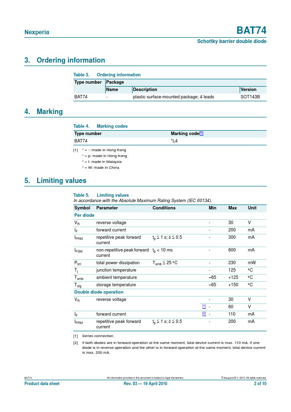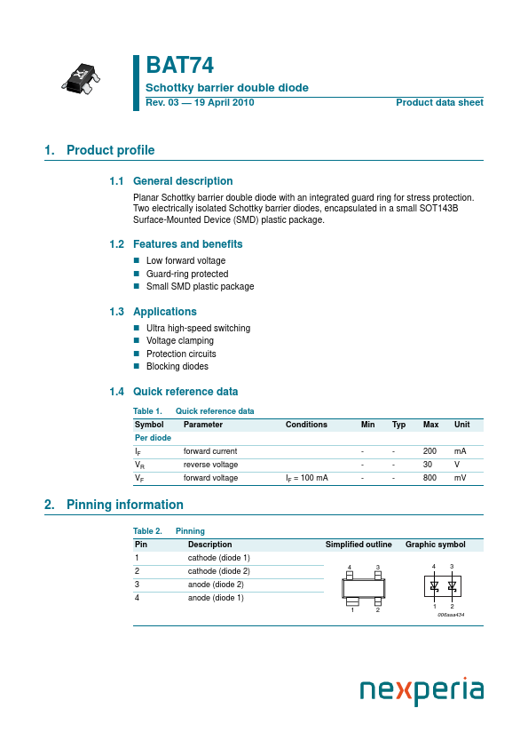 Overview: BAT74 Schottky barrier double diode Rev. 03 — 19 April 2010 Product data sheet 1. Product profile 1.