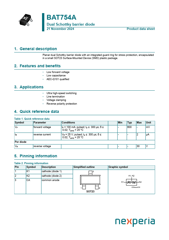 Overview: BAT754A Dual Schottky barrier diode 21 November 2024 Product data sheet 1.