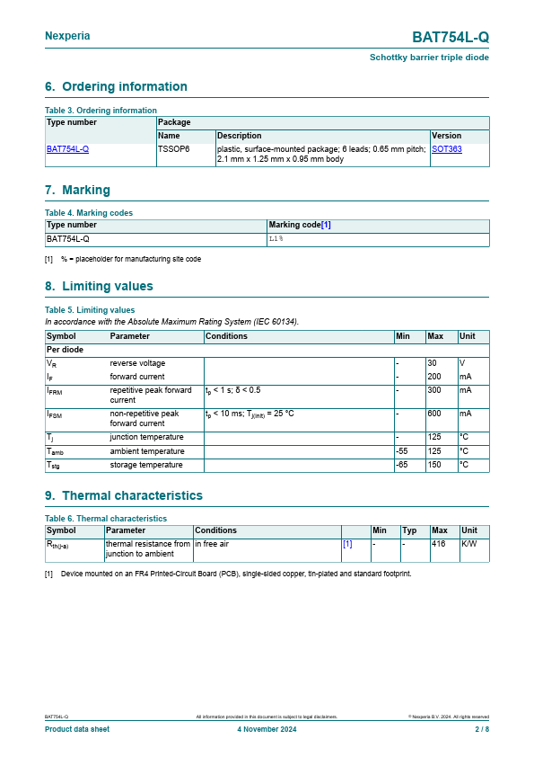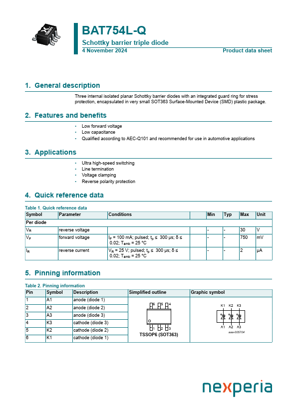 Overview: BAT754L-Q Schottky barrier triple diode 4 November 2024 Product data sheet 1.