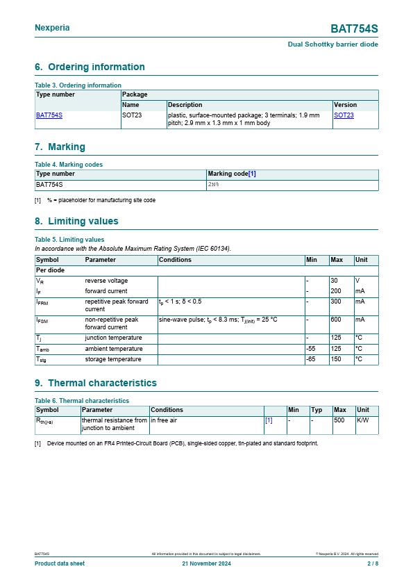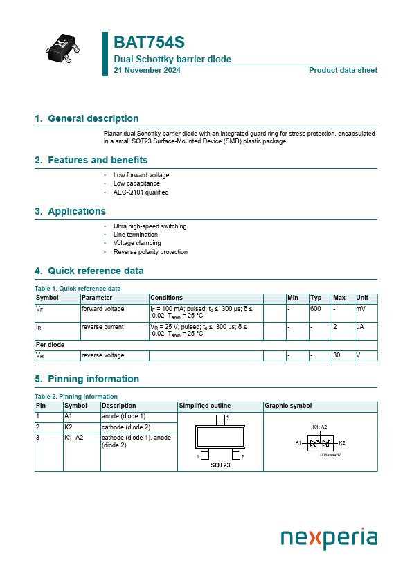 Overview: BAT754S Dual Schottky barrier diode 21 November 2024 Product data sheet 1.