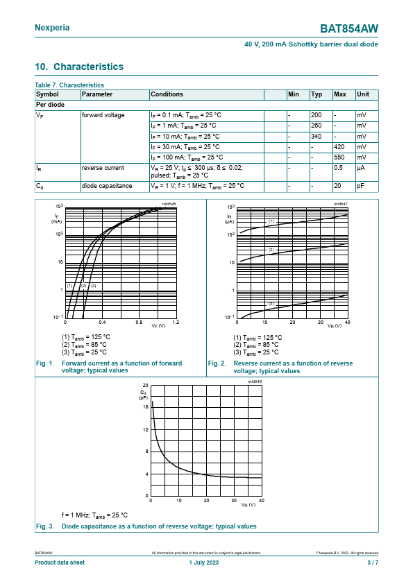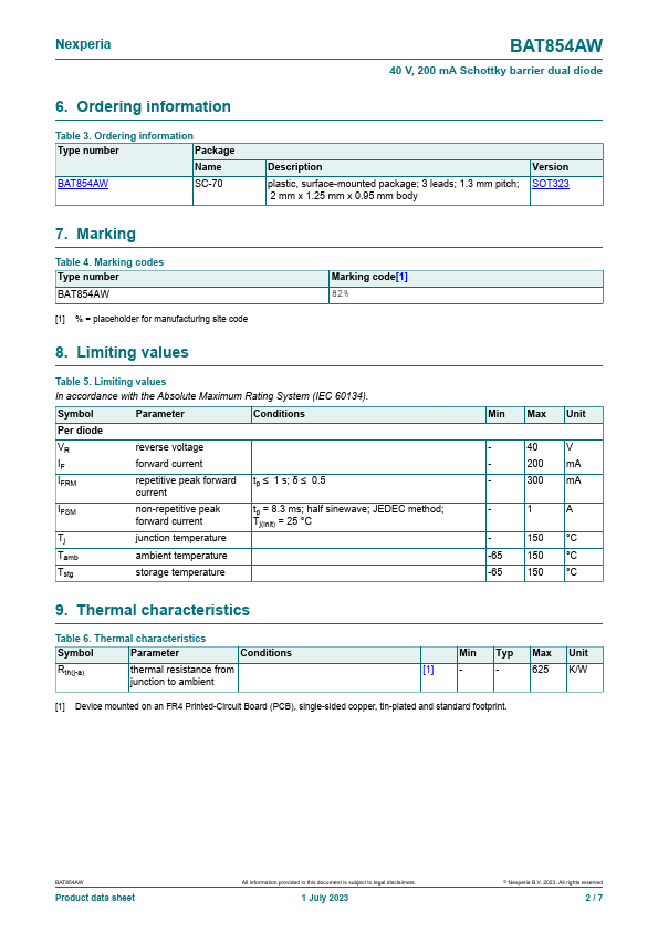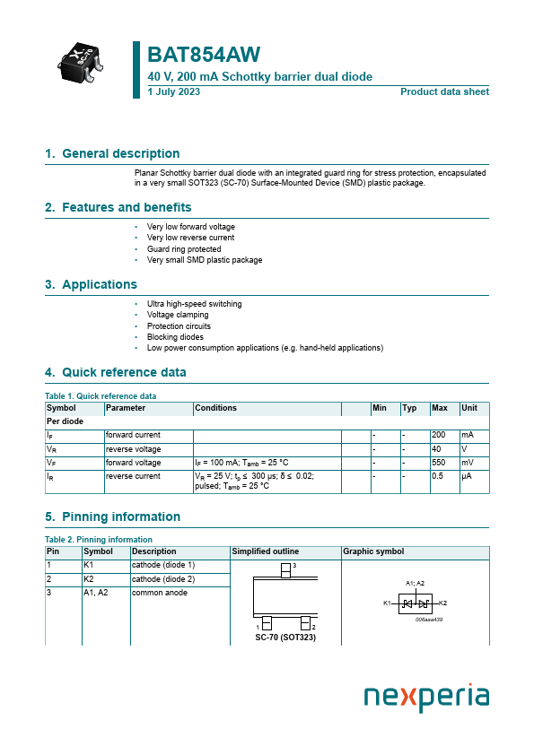 Overview: BAT854AW 40 V, 200 mA Schottky barrier dual diode 1 July 2023 Product data sheet 1.