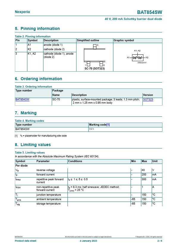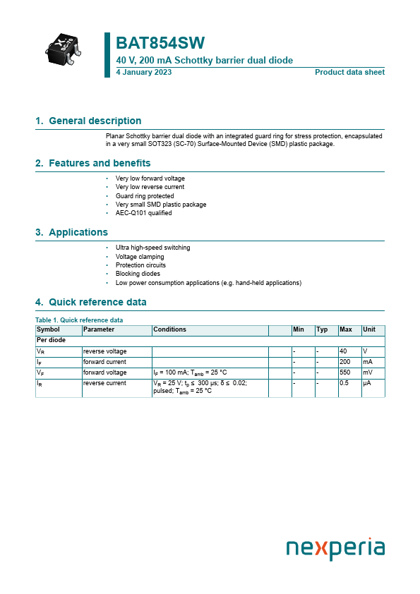 Overview: BAT854SW 40 V, 200 mA Schottky barrier dual diode 4 January 2023 Product data sheet 1.
