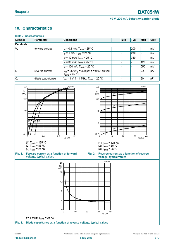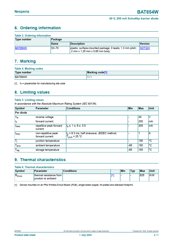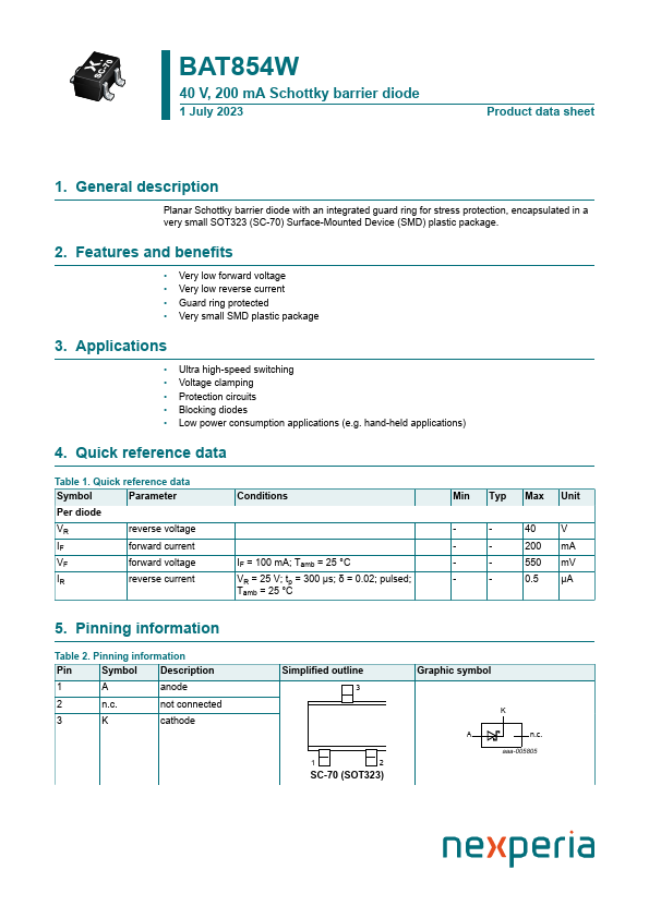 Overview: BAT854W 40 V, 200 mA Schottky barrier diode 1 July 2023 Product data sheet 1.