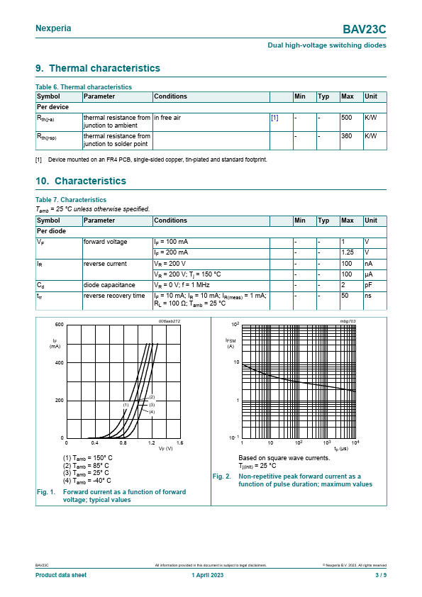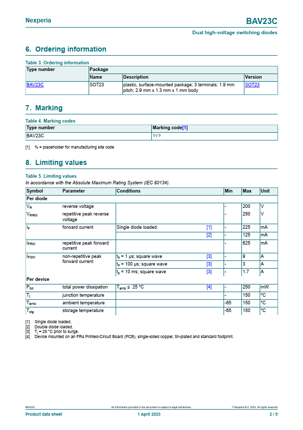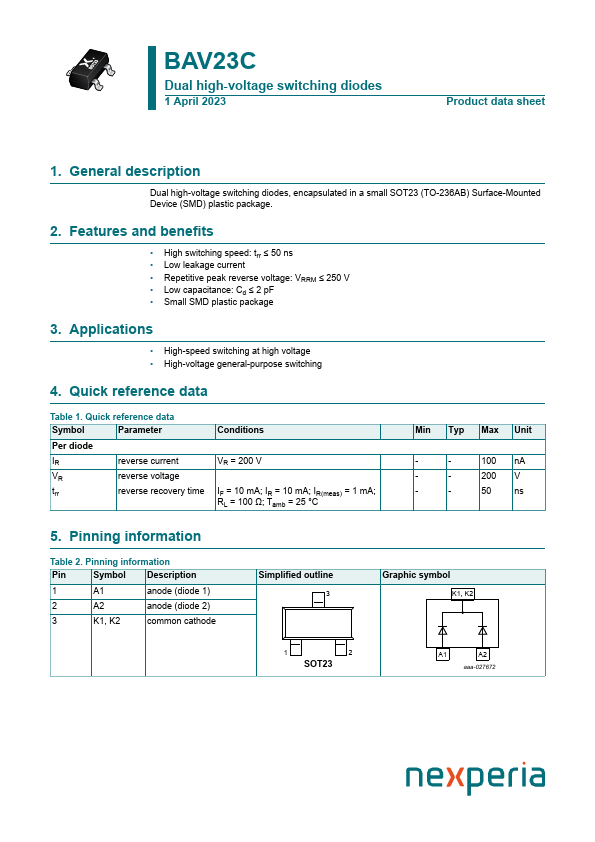 Dual high-voltage switching diodes, encapsulated in a small SOT23 (TO-236AB) Surface-Mounted Device (SMD) plastic package.