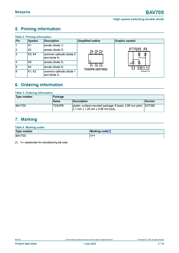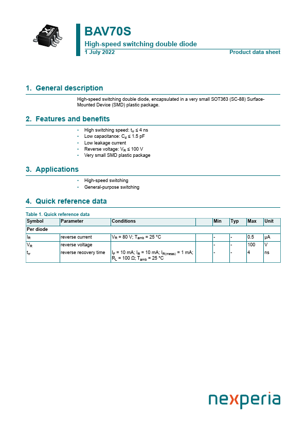 High-speed switching double diode, encapsulated in a very small SOT363 (SC-88) SurfaceMounted Device (SMD) plastic package.