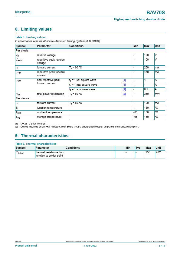 - Reverse voltage: VR ≤ 100 V
