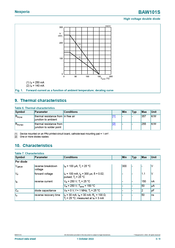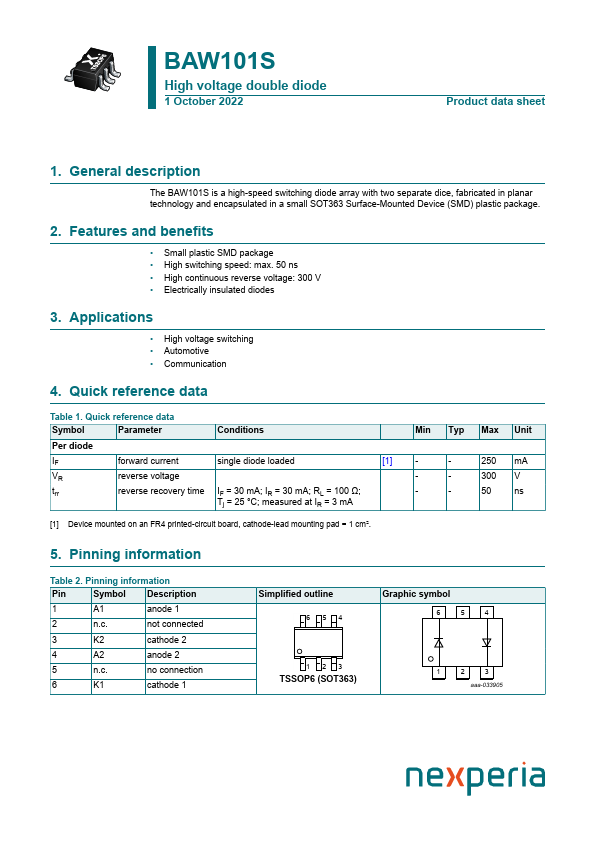The BAW101S is a high-speed switching diode array with two separate dice, fabricated in planar technology and encapsulated in a small SOT363 Surface-Mounted Device (SMD) plastic package.