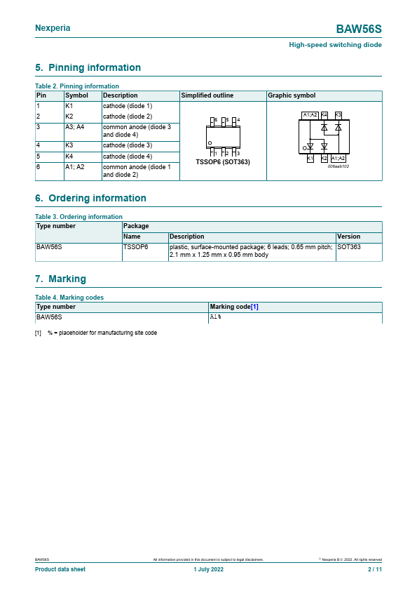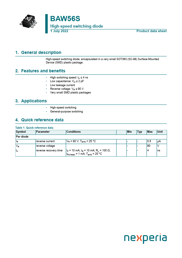 High-speed switching diode, encapsulated in a very small SOT363 (SC-88) Surface-Mounted Device (SMD) plastic package.