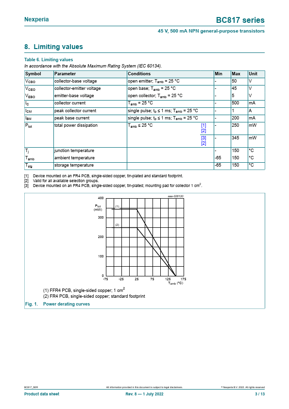 Overview: BC817 series 45 V, 500 mA NPN general-purpose transistors Rev. 8 — 1 July 2022 Product data sheet 1.