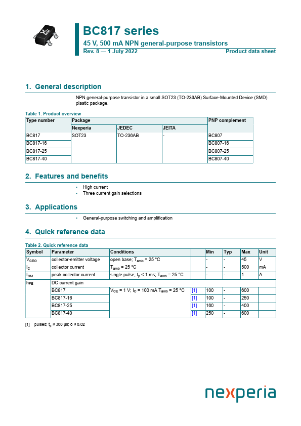 Overview: BC817 series 45 V, 500 mA NPN general-purpose transistors Rev. 8 — 1 July 2022 Product data sheet 1.