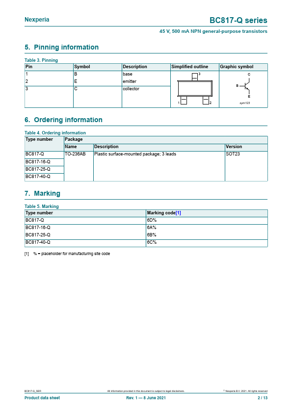 Overview: BC817-Q series 45 V, 500 mA NPN general-purpose transistors Rev. 1 — 8 June 2021 Product data sheet 1.