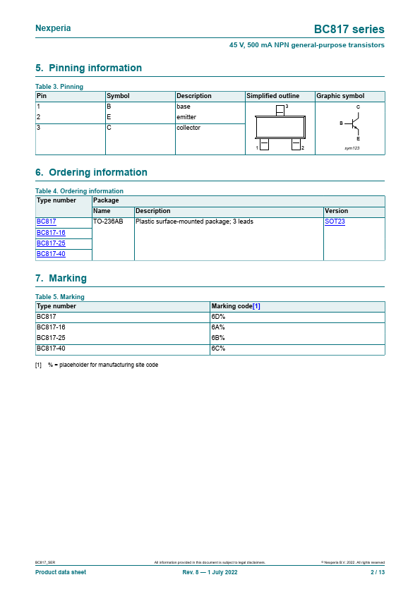 Overview: BC817 series 45 V, 500 mA NPN general-purpose transistors Rev. 8 — 1 July 2022 Product data sheet 1.