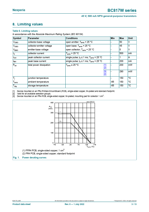 Overview: BC817W series 45 V, 500 mA NPN general-purpose transistors Rev. 8 — 1 July 2022 Product data sheet 1.