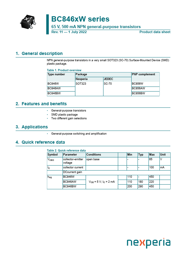 Product overview Type number Package Nexperia BC846W SOT323 BC846AW BC846BW JEDEC SC-70 PNP complement BC856W BC856AW BC856BW 2.