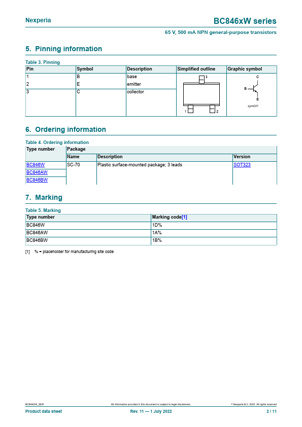 NPN general-purpose transistors in a very small SOT323 (SC-70) Surface-Mounted Device (SMD) plastic package. Product overview Type number Package Nexperia BC846W SOT323 BC846AW BC846BW JEDEC SC-70 PNP plement BC856W BC856AW BC856BW.