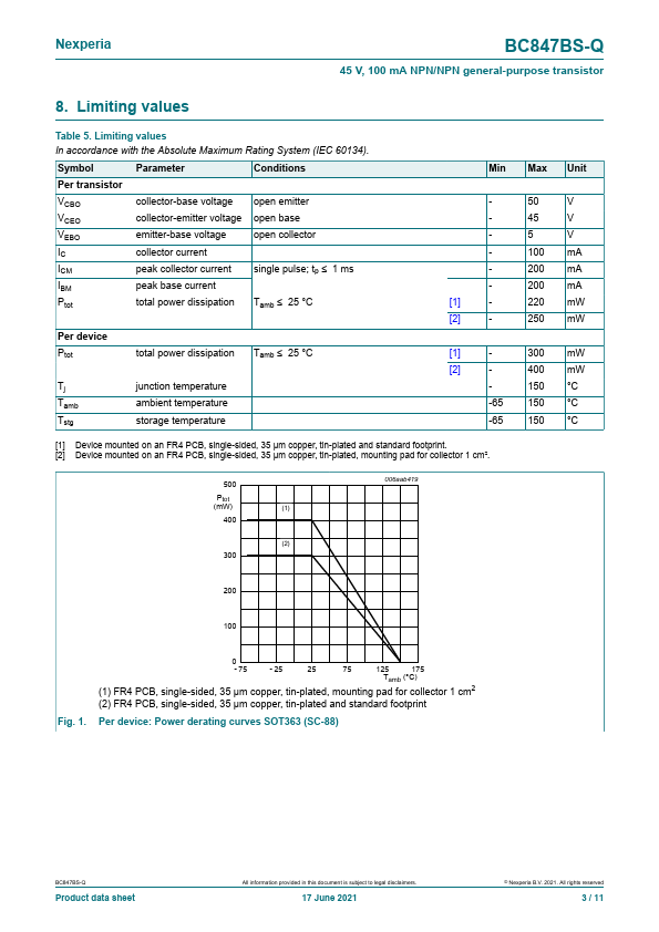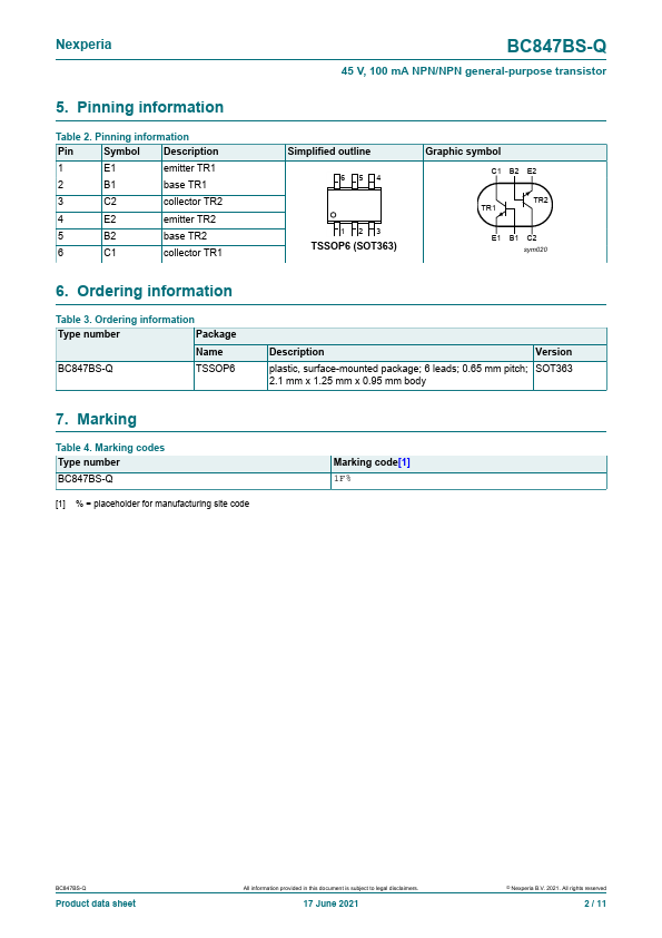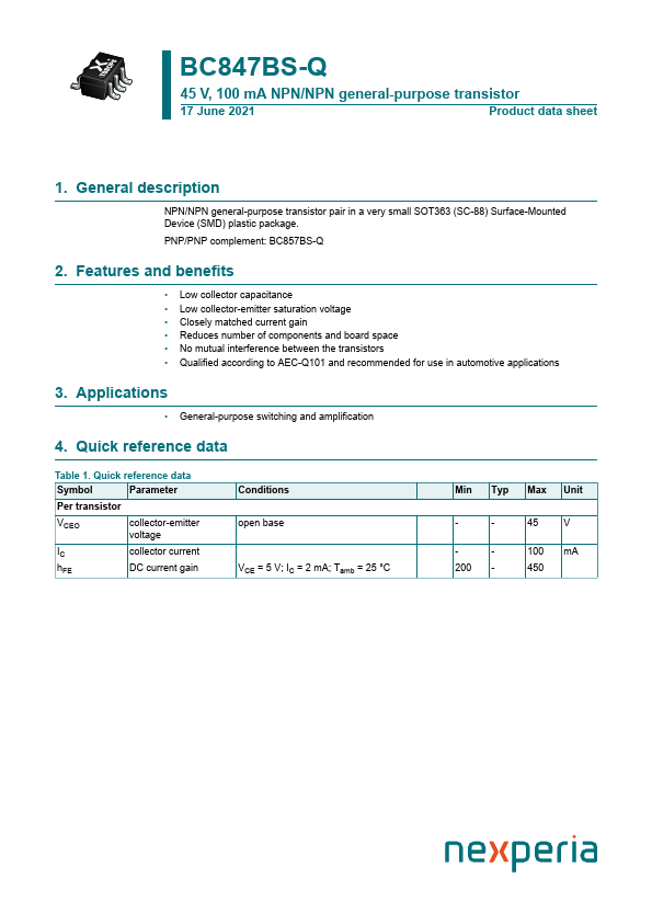 Overview: BC847BS-Q 45 V, 100 mA NPN/NPN general-purpose transistor 17 June 2021 Product data sheet 1.