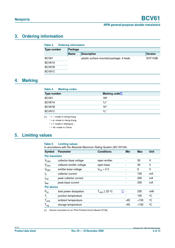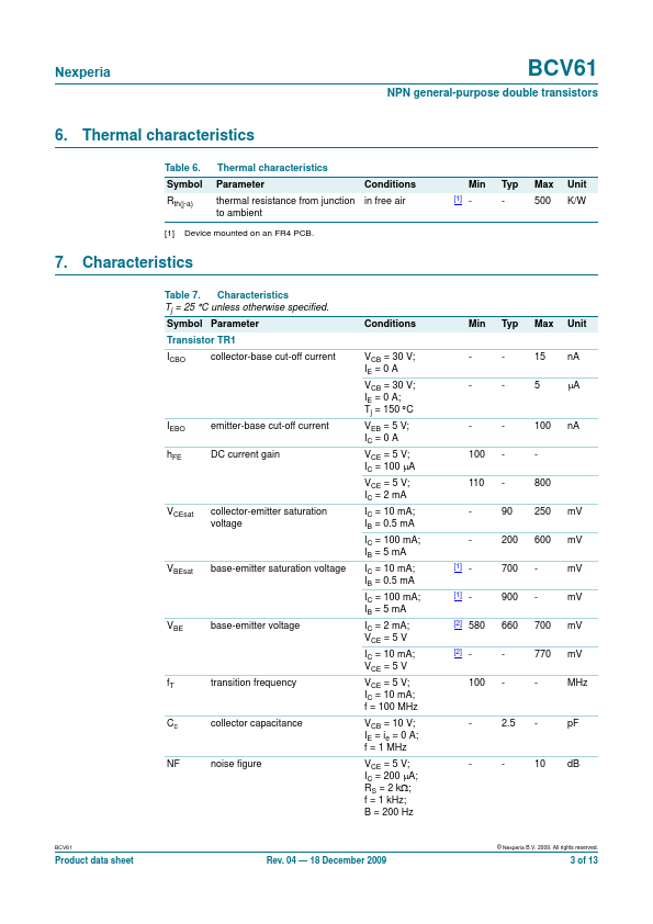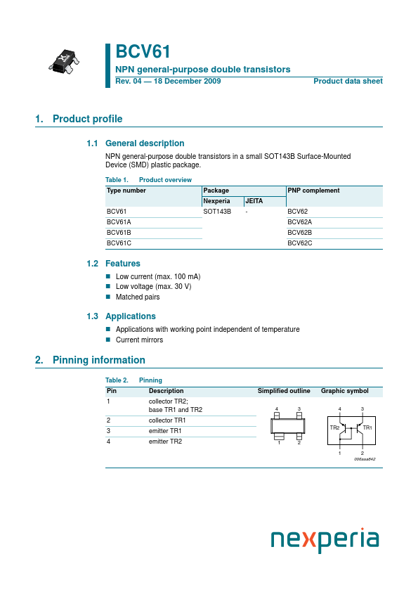 Overview: BCV61 NPN general-purpose double transistors Rev. 04 — 18 December 2009 Product data sheet 1. Product profile 1.
