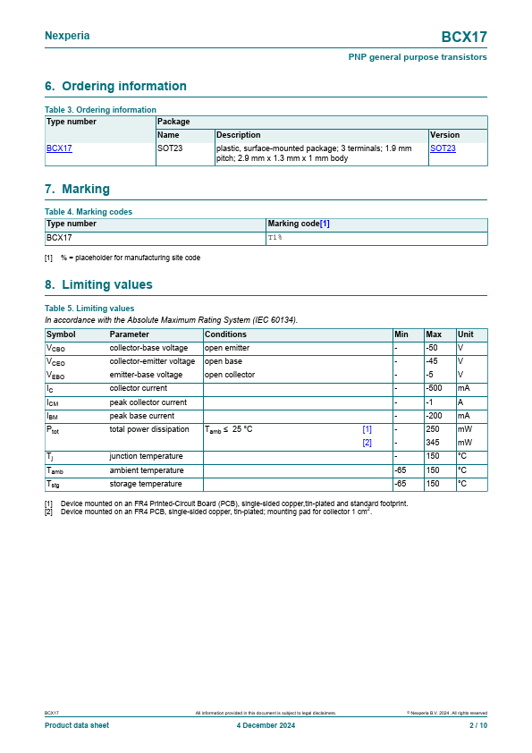 BCX17 PNP general purpose transistors 4 December 2024 Product data sheet 1.