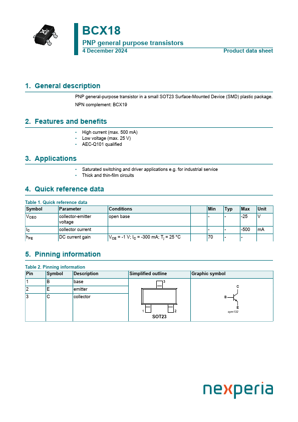 Overview: BCX18 PNP general purpose transistors 4 December 2024 Product data sheet 1.
