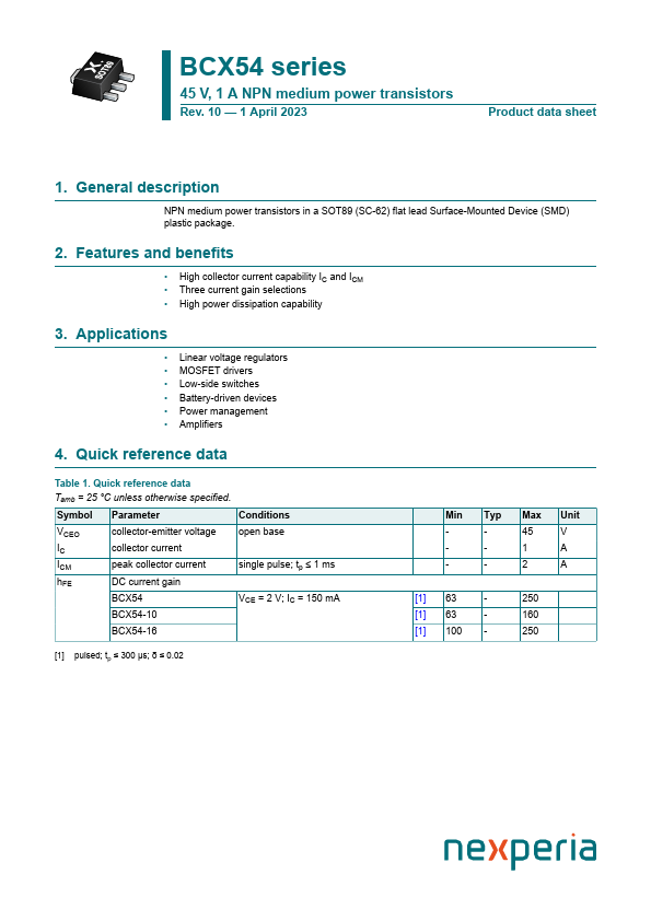 Overview: BCX54 series 45 V, 1 A NPN medium power transistors Rev. 10 — 1 April 2023 Product data sheet 1.