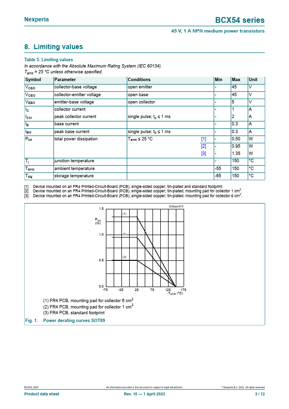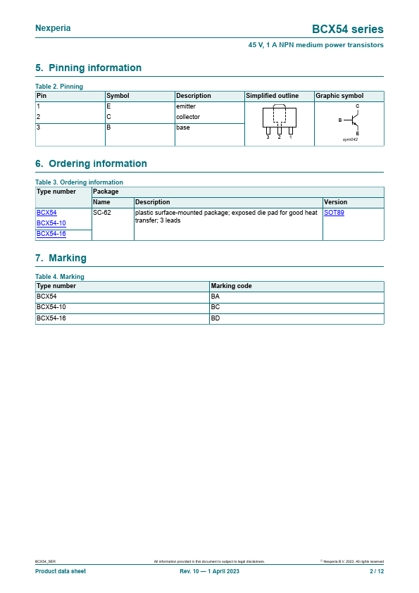 Overview: BCX54 series 45 V, 1 A NPN medium power transistors Rev. 10 — 1 April 2023 Product data sheet 1.