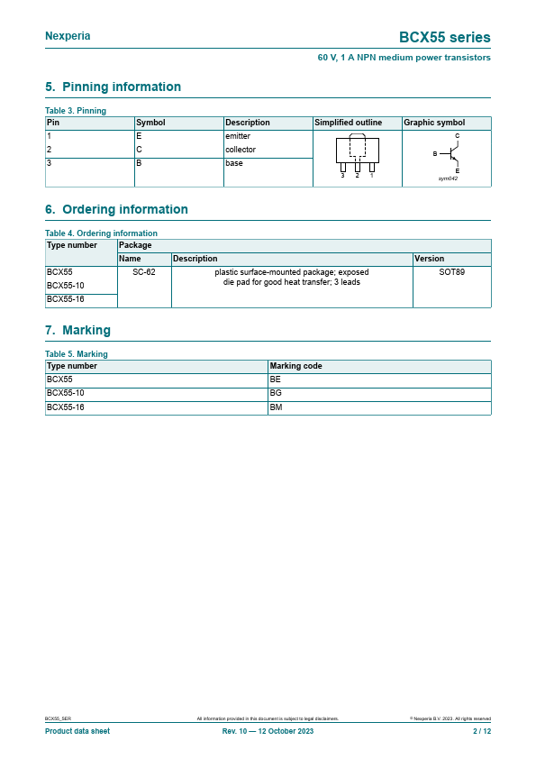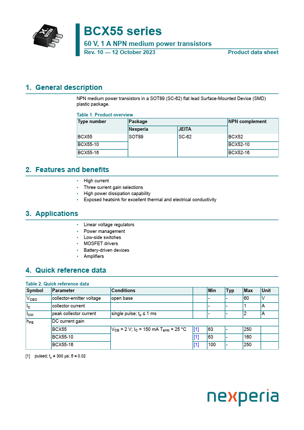 Overview: BCX55 series 60 V, 1 A NPN medium power transistors Rev. 10 — 12 October 2023 Product data sheet 1.