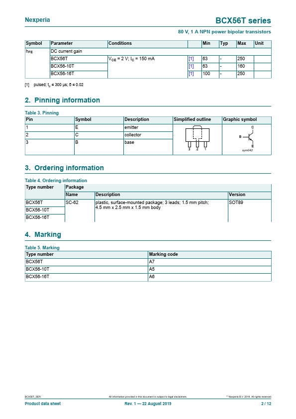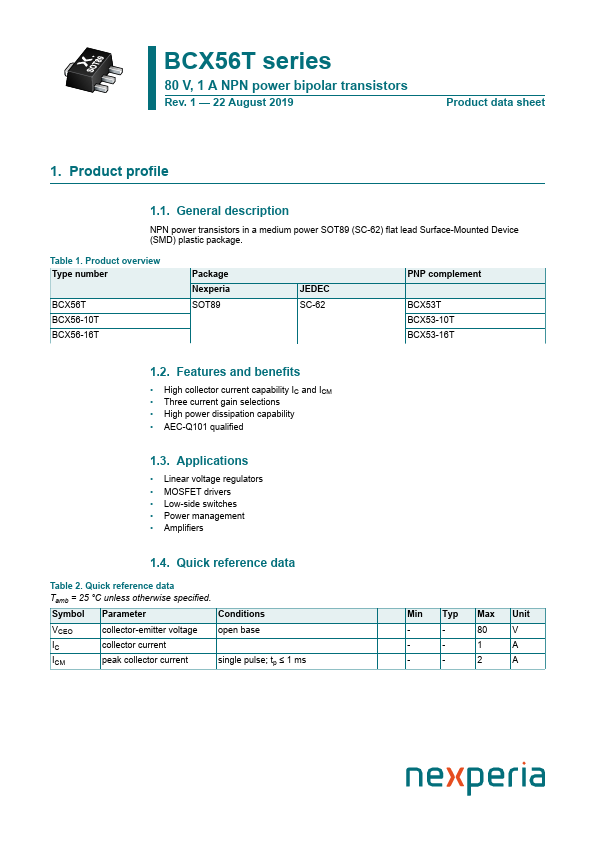 Overview: BCX56T series 80 V, 1 A NPN power bipolar transistors Rev. 1 — 22 August 2019 Product data sheet 1. Product profile 1.1.