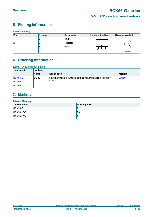 Overview: BCX56-Q series 80 V, 1 A NPN medium power transistors Rev. 3 — 23 June 2023 Product data sheet 1.