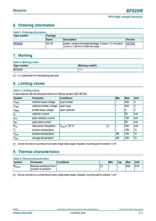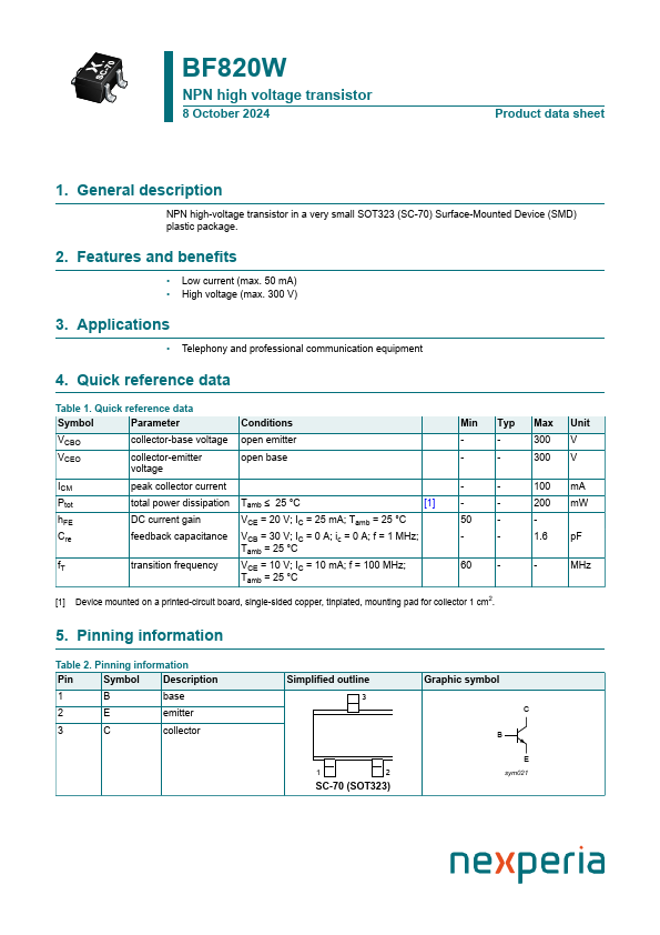 Overview: BF820W NPN high voltage transistor 8 October 2024 Product data sheet 1.