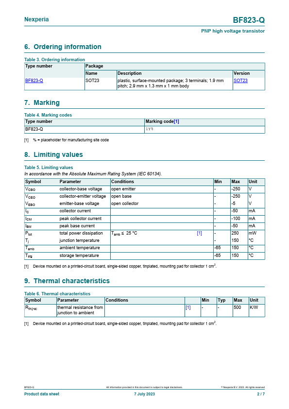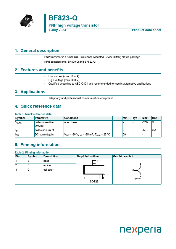 Overview: BF823-Q PNP high voltage transistor 7 July 2023 Product data sheet 1.
