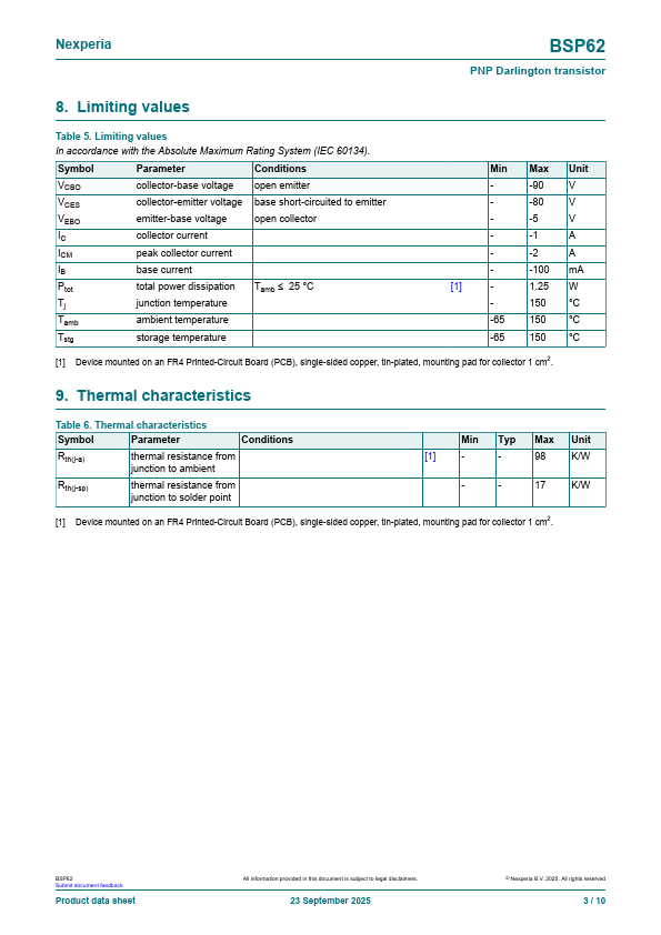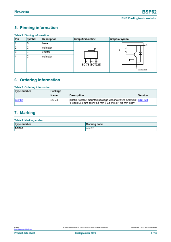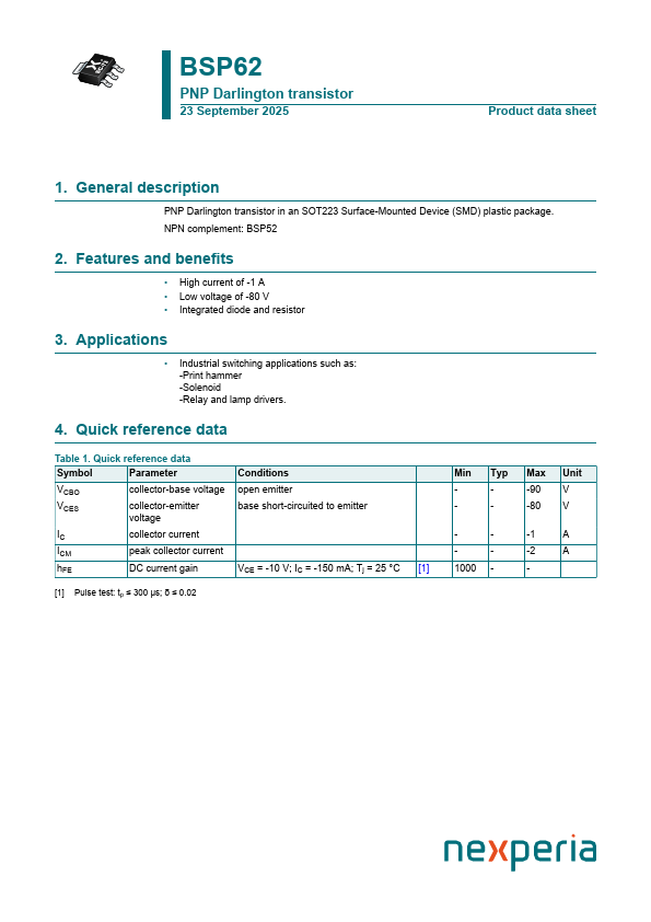 Overview: BSP62 PNP Darlington transistor 23 September 2025 Product data sheet 1.
