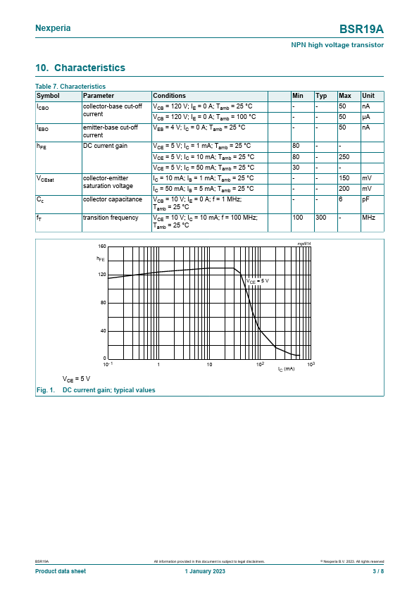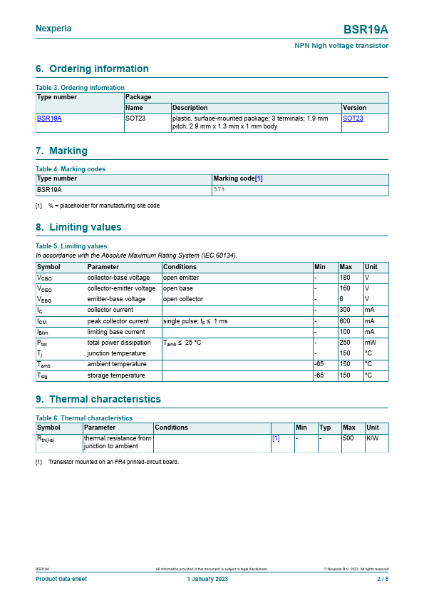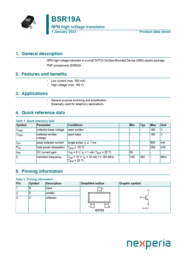 Overview: BSR19A NPN high voltage transistor 1 January 2023 Product data sheet 1.