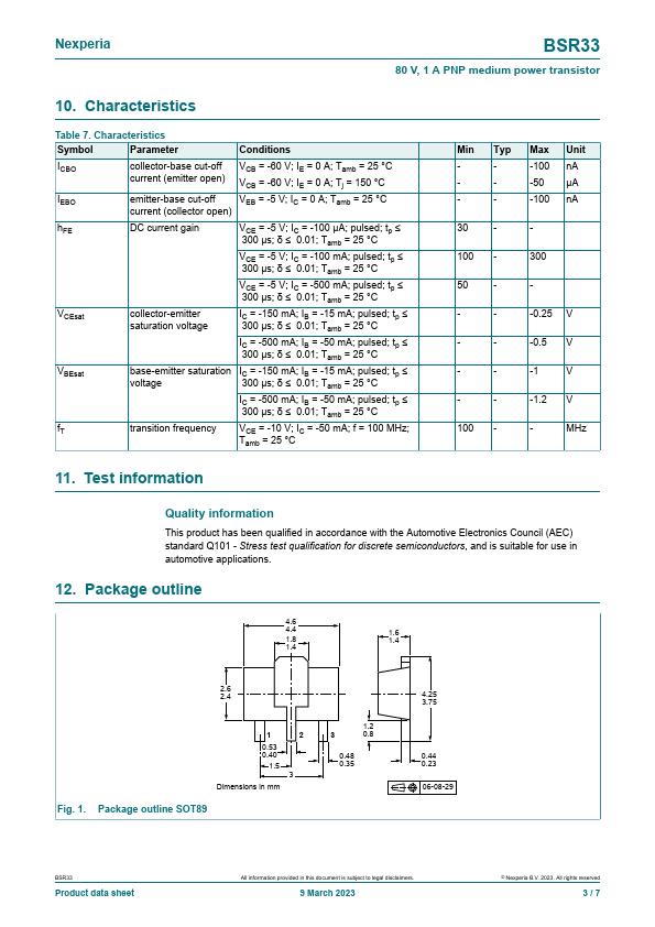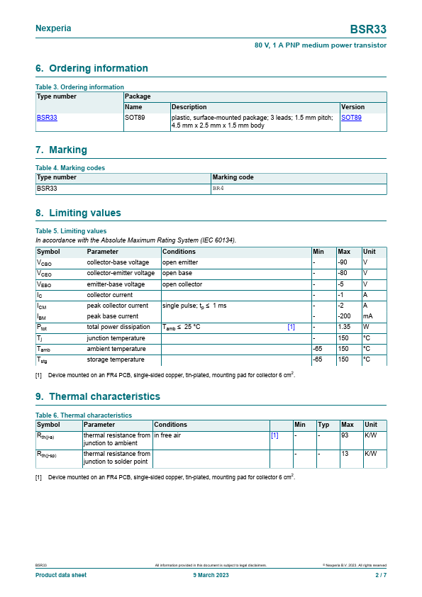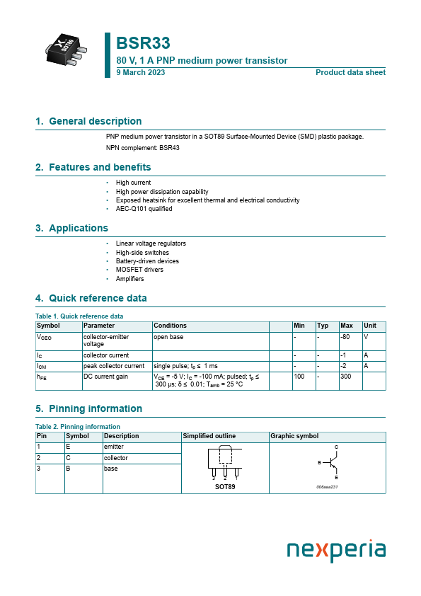 Overview: BSR33 80 V, 1 A PNP medium power transistor 9 March 2023 Product data sheet 1.