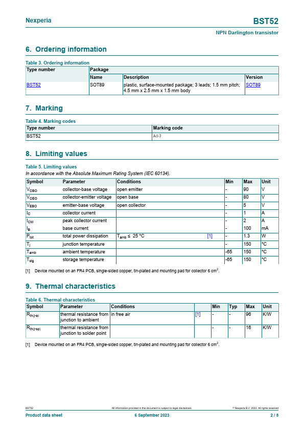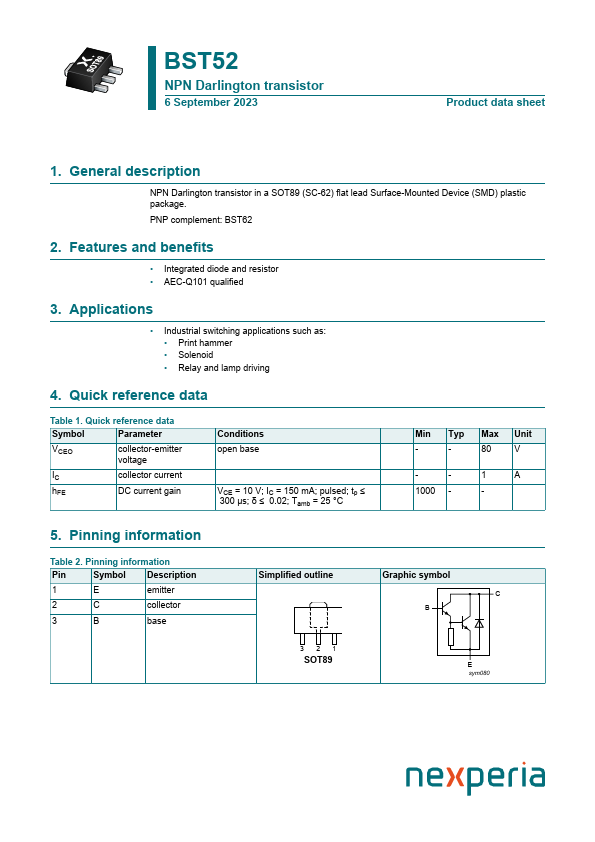 Overview: BST52 NPN Darlington transistor 6 September 2023 Product data sheet 1.