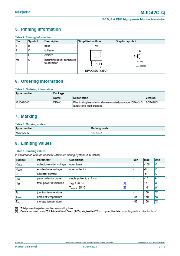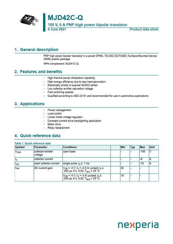Overview: MJD42C-Q 100 V, 6 A PNP high power bipolar transistor 8 June 2021 Product data sheet 1.