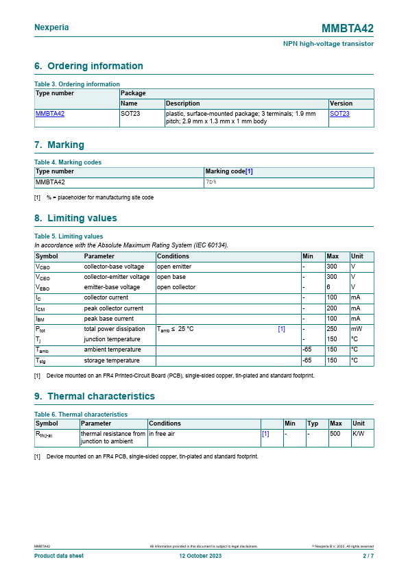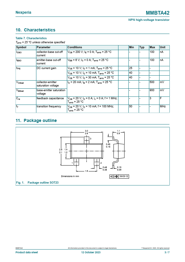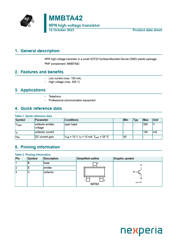 Overview: MMBTA42 NPN high-voltage transistor 12 October 2023 Product data sheet 1.