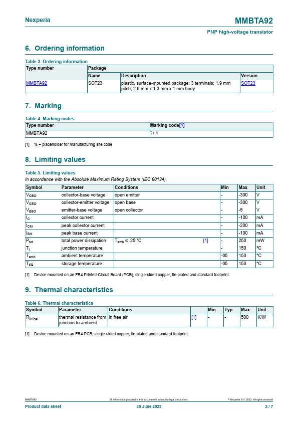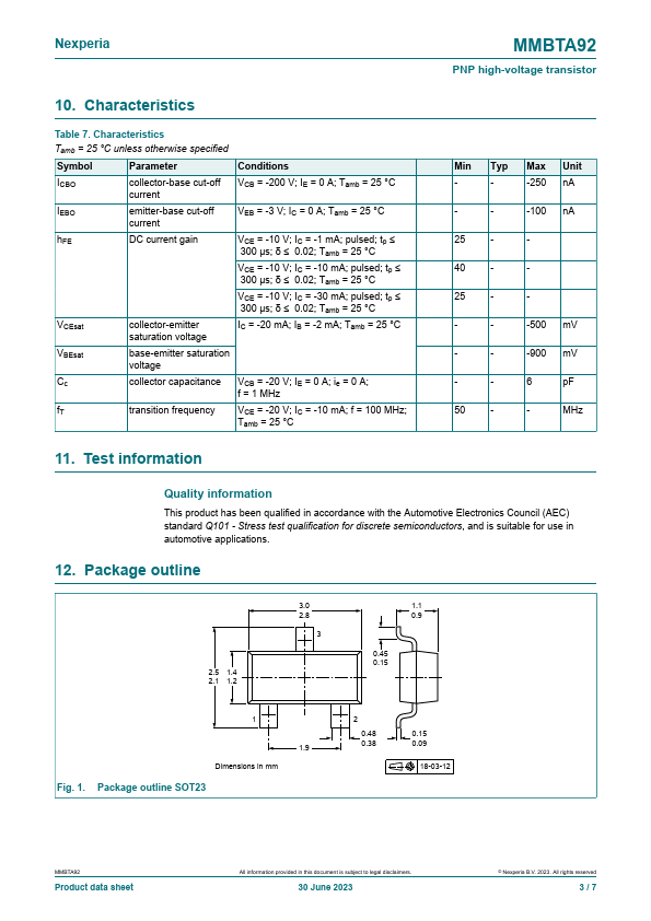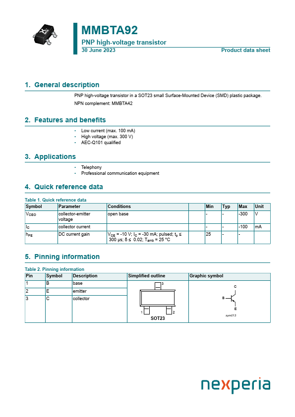 Overview: MMBTA92 PNP high-voltage transistor 30 June 2023 Product data sheet 1.