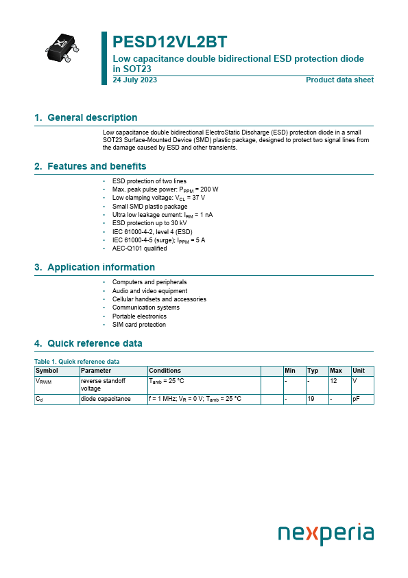 Low capacitance double bidirectional ElectroStatic Discharge (ESD) protection diode in a small SOT23 Surface-Mounted Device (SMD) plastic package, designed to protect two signal lines from the damage caused by ESD and other transients.