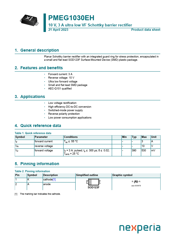 Planar Schottky barrier rectifier with an integrated guard ring for stress protection, encapsulated in a small and flat lead SOD123F Surface-Mounted Device (SMD) plastic package.
